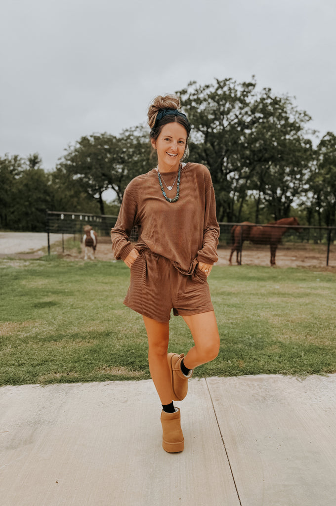 Experience ultimate comfort and chic style with this essential corded set for your fall wardrobe. The neutral brown color is not only versatile, but also pairs well with any accent color. Some sources even claim that it is the new black!